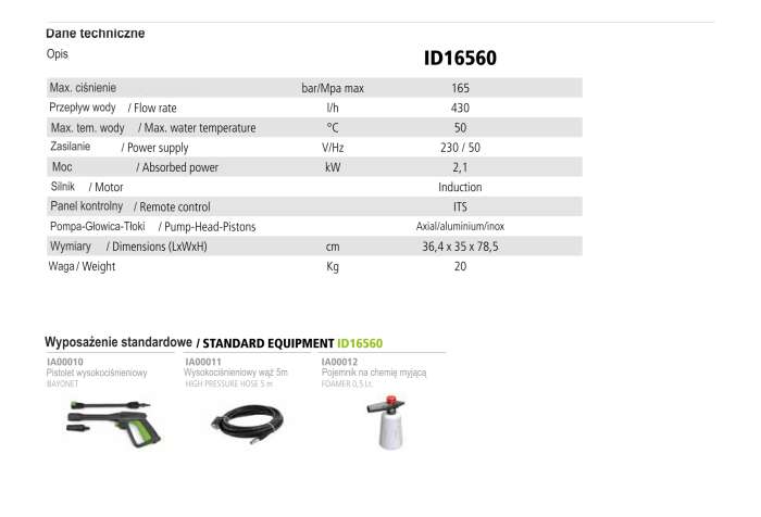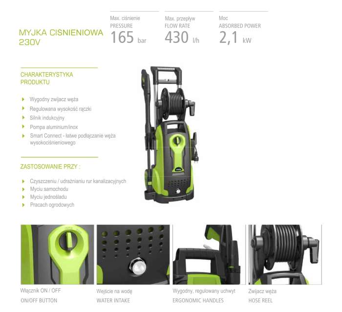Dodatkowo myjka posiada silnik indukcyjny, pompę wykonaną z aluminium oraz stali inox.